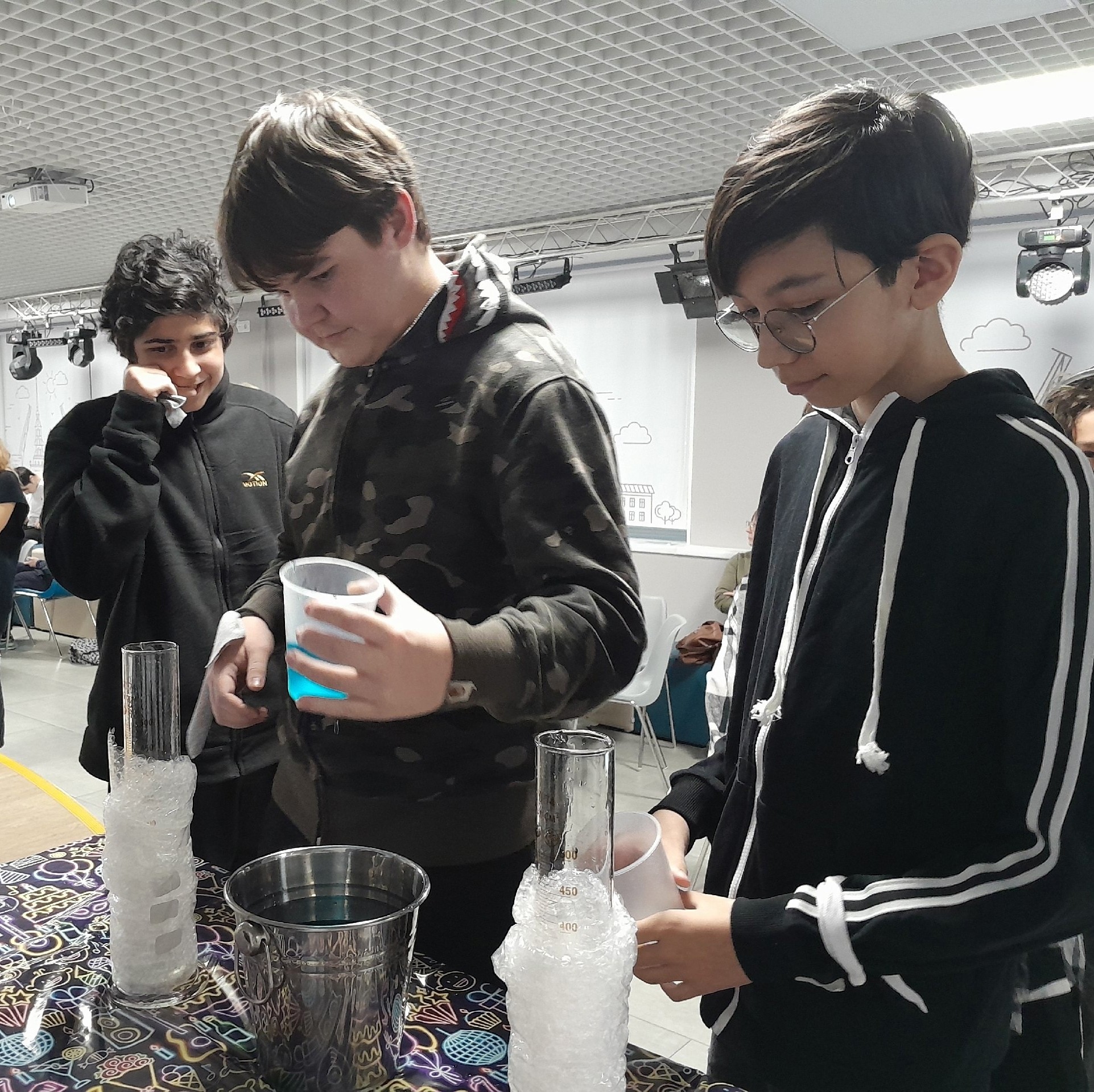 Ребята вспомнили полученные знания по предметам химия, биология, физика, математика. Участвовали в органолептическом исследовании разных растворов. Провели качественные реакции. Было интересно!