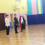 В спортивном зале старшего корпуса почётное право вынести флаг было предоставлено знамённой группе в составе: