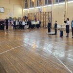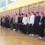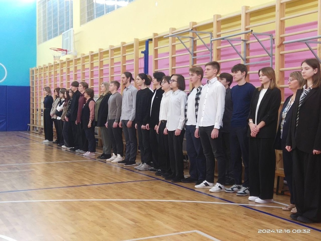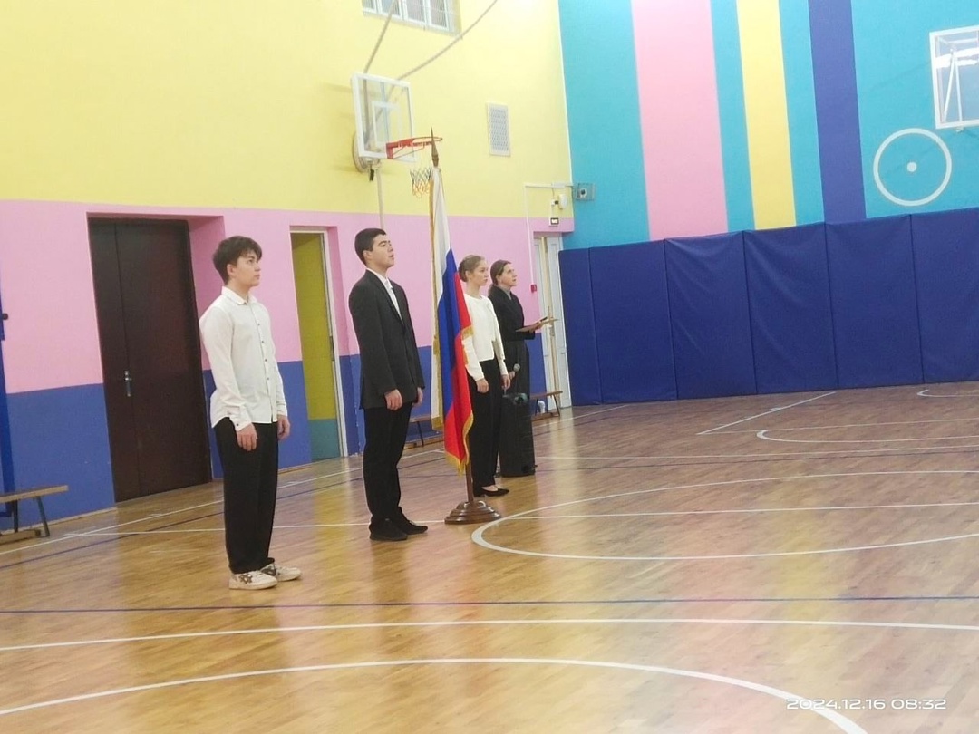 В спортивном зале старшего корпуса почётное право вынести флаг было предоставлено знамённой группе в составе: