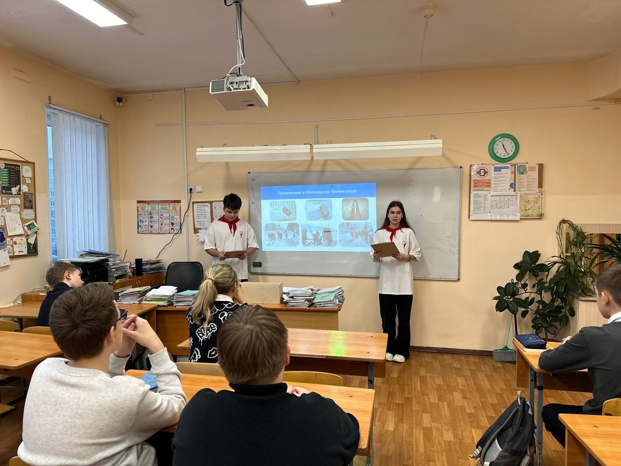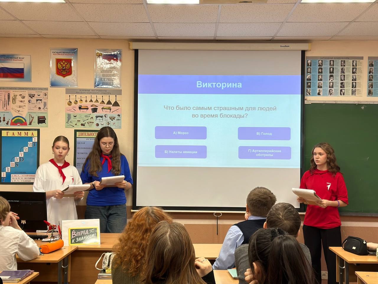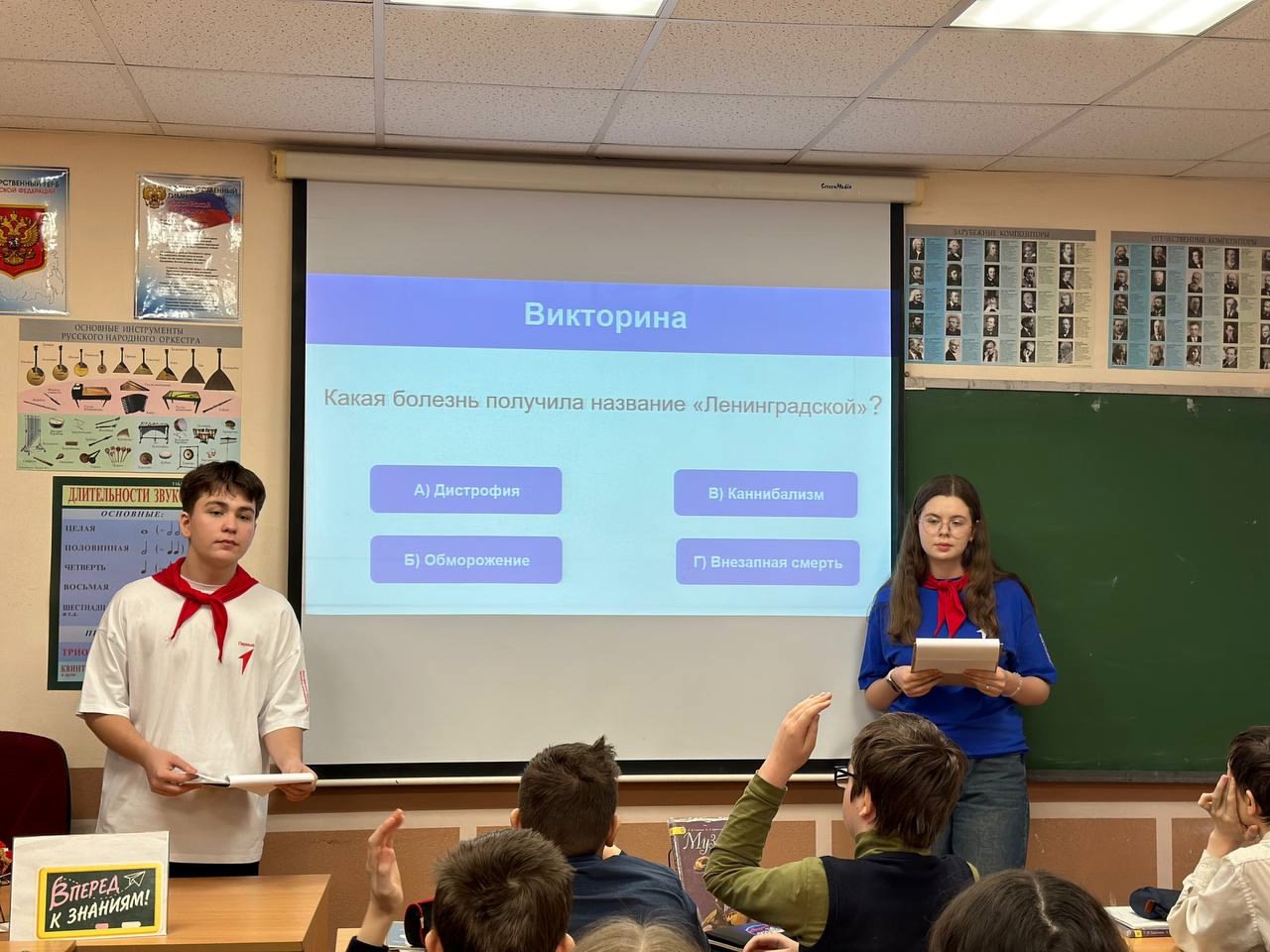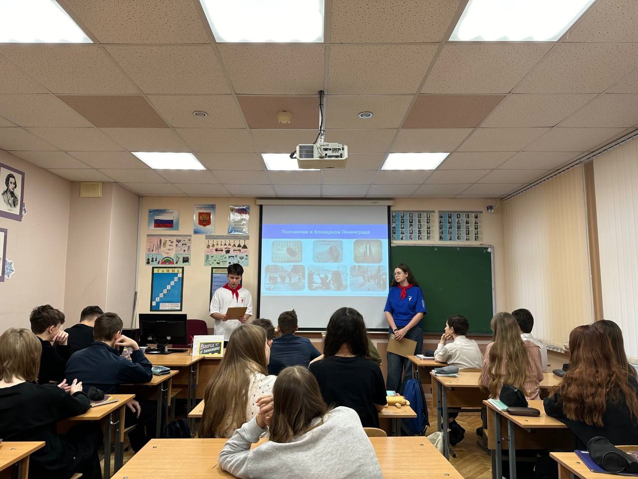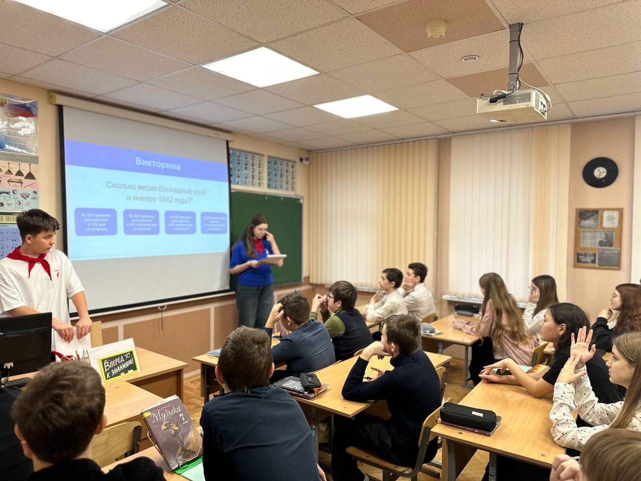 Активисты «Движения Первых» организовали мероприятие для учеников 7Б, 7Д и 7К классов, направленное на расширение знаний о блокаде Ленинграда и Великой Отечественной войне 1941–1945 годов.