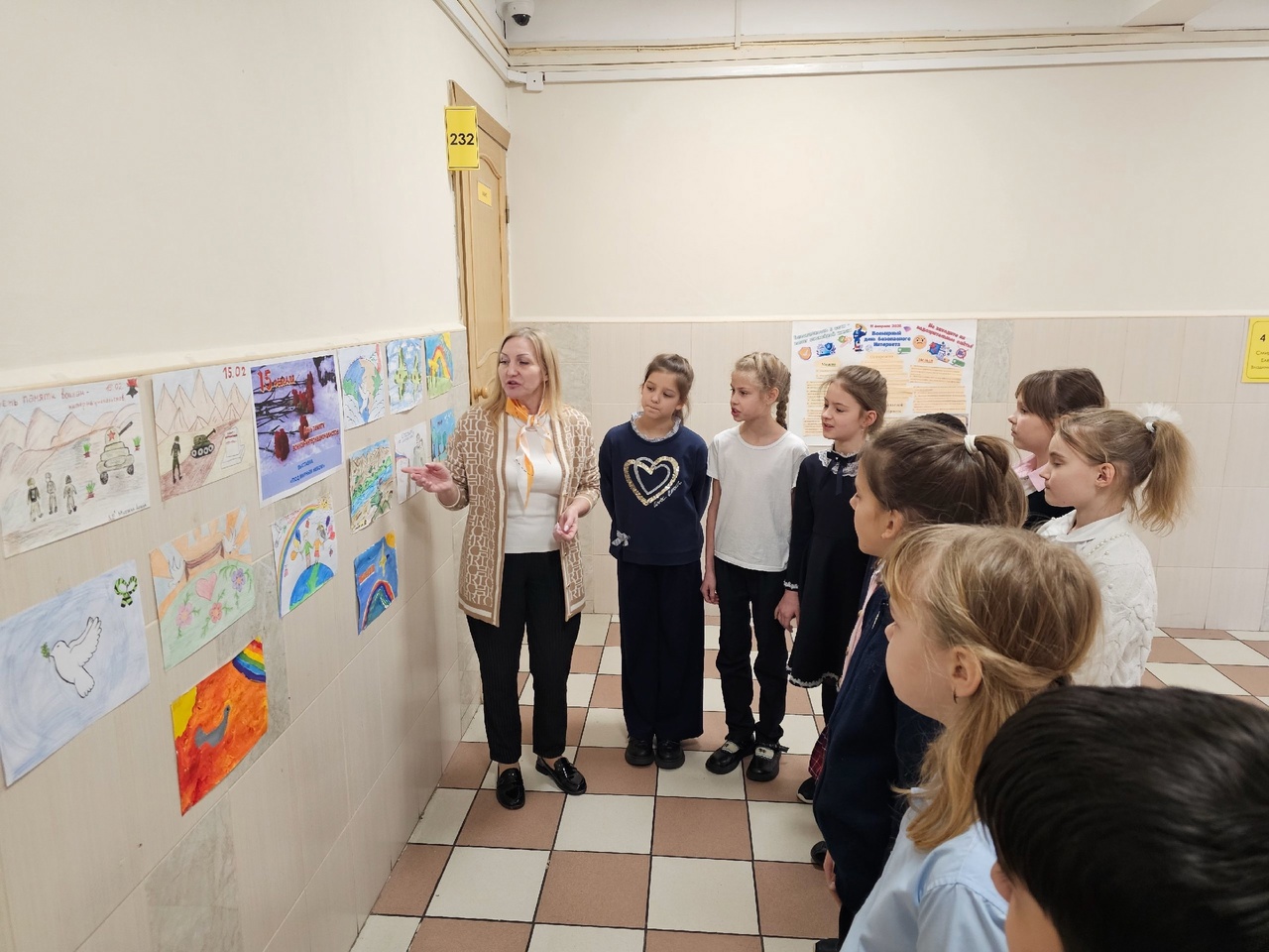 В преддверии памятной даты советником директора по воспитанию была организованна выставка детских рисунков «Под мирным небом». В работах, представленных на выставке, ребята нарисовали природу, родных и близких людей, тепло родного дома. Всё это требует бережного отношения и защиты.