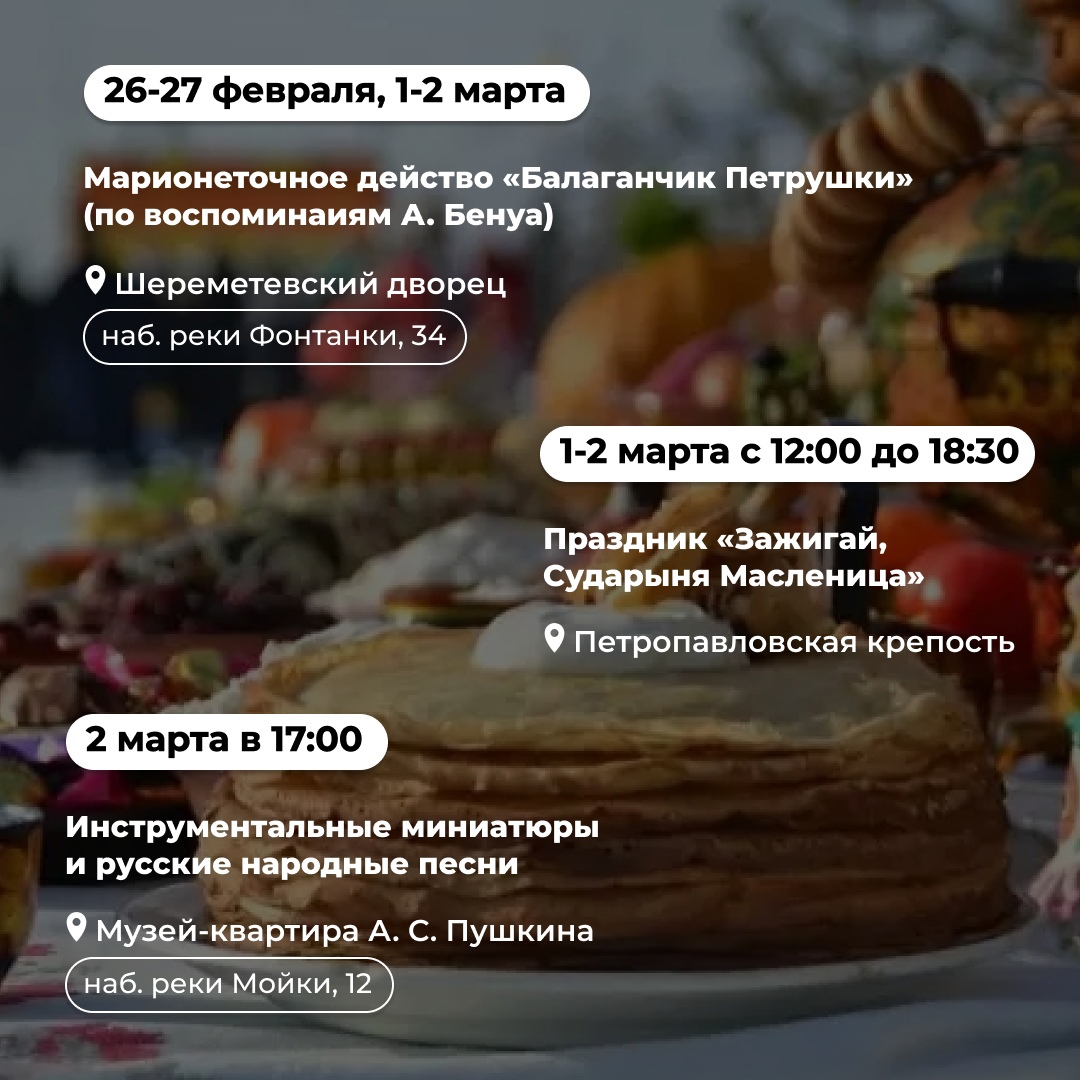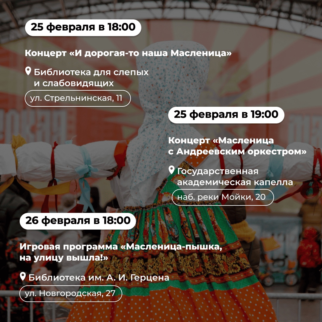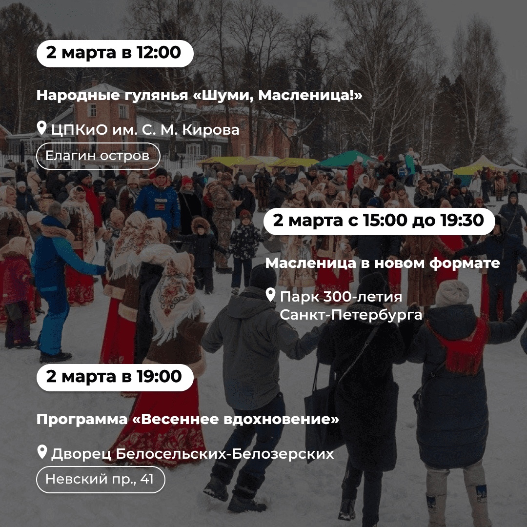 26 Фев 2025 На Масленичной неделе город подготовил для вас много мероприятий. Многие начинаются вечером, так что перед ними вы успеете сделать домашние задания на следующий день. Выбирайте мероприятия из подборки и наслаждайтесь народным праздником!