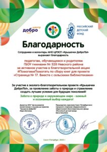 В феврале, гимназисты принимали активное участие в акции, посвящённой Дню книгодарения, организованной центром содействия социальным и благотворительным проектам «ОГОНЕК ДОБРА» и центром развития экологических и социальных проектов «Крышечки ДоброТЫ» по сбору книг для сельских библиотек.