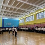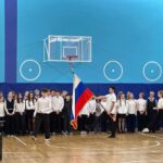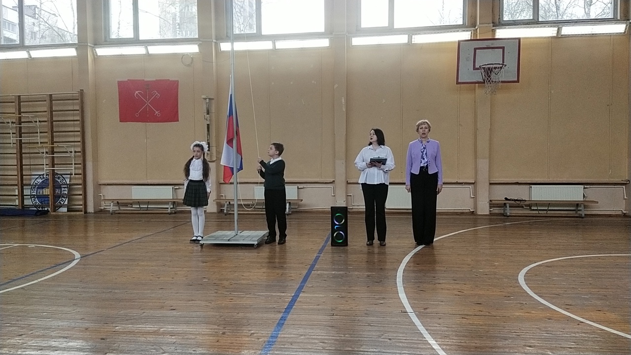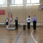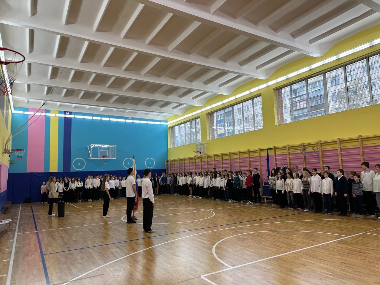 В спортивном зале старшего корпуса почётное право вынести флаг было предоставлено знамённой группе в составе: Нуриев Руслан, Соколов Максим, Шведова Ульяна.