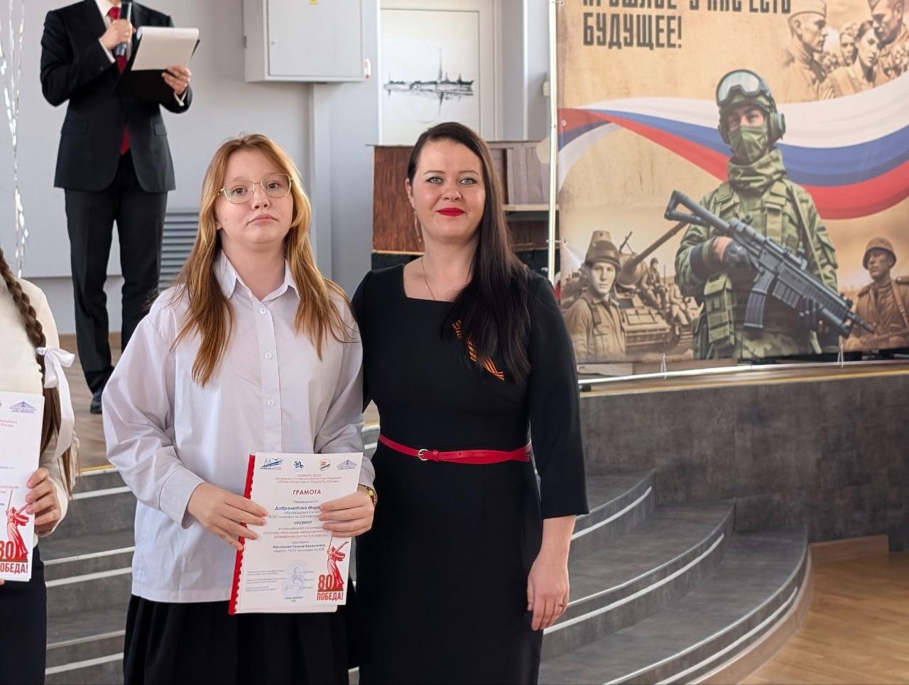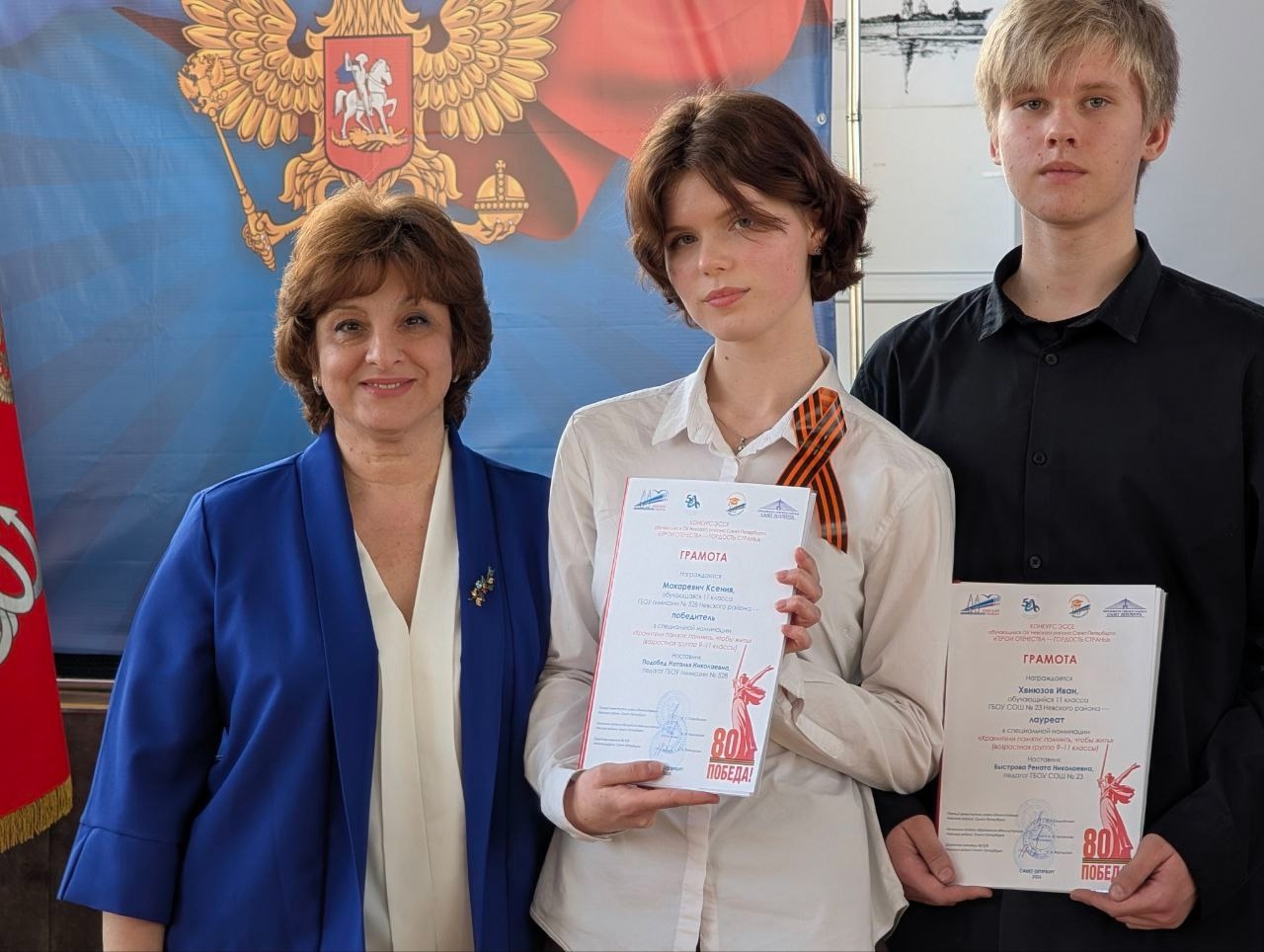 Грамоты ПОБЕДИТЕЛЯ в номинации Авторская мастерская «Память сердца: никто не забыт, ничто не забыто!» завоевал творческий дуэт — Кириллов Игорь (11 кл) и наставник — Подобед Наталья Николаевна, в номинации «Хранители памяти: помнить, чтобы жить» — Макаревич Ксения (11 кл) и наставник Подобед Наталья Николаевна . ЛАУРЕАТАМИ в номинации «Моей истории 80 лет. Письмо в прошлое» стали дуэты — Щукина Станислава (6 кл), наставник — Желтикова Галина Валерьевна и Смирнова Арина (8 кл) и наставник Тихомирова Елена Александровна, в номинации Летопись «Наследие героев земли русской» — Добролюбова Мирослава (6 кл) и наставник Желтикова Галина Валерьевна.