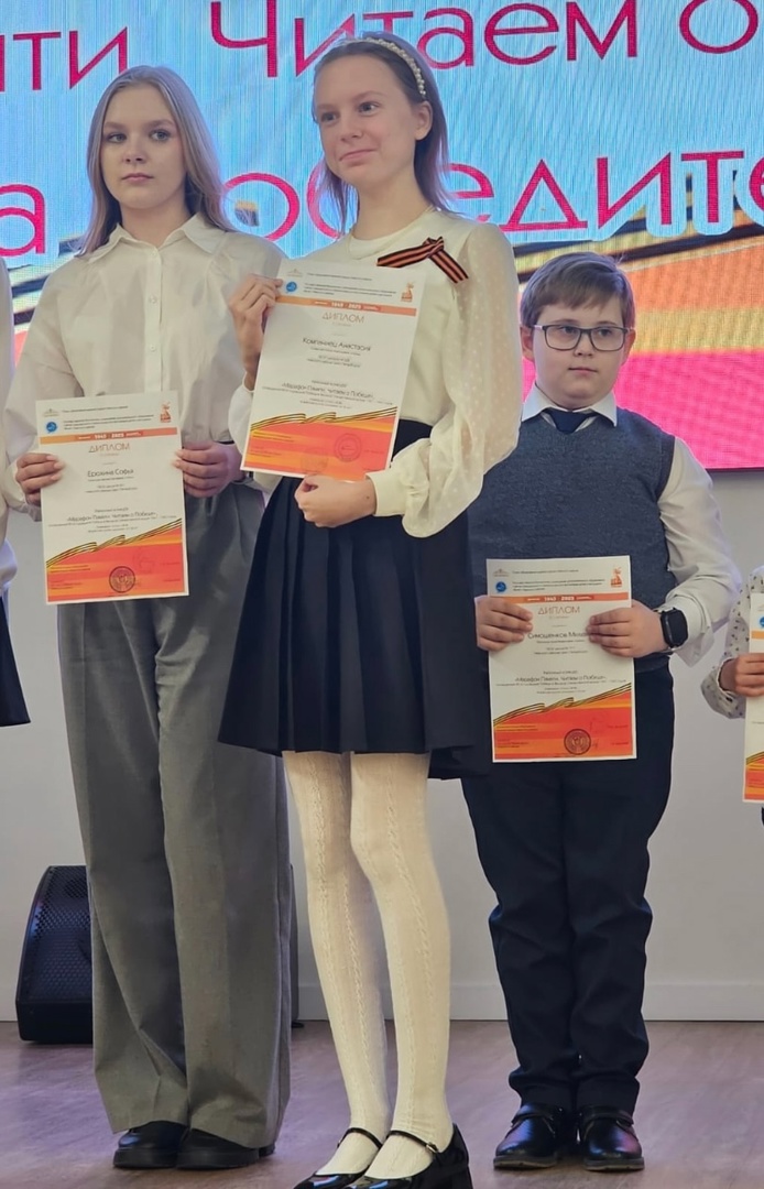 В номинации «Марафон памяти. Читаем о Победе» диплом I степени получил Каражинас Артём 6г класс и диплом II степени Компаниец Анастасия 8д класс-наставник Привалова Ирина Анатольевна, учитель русского языка и литературы.