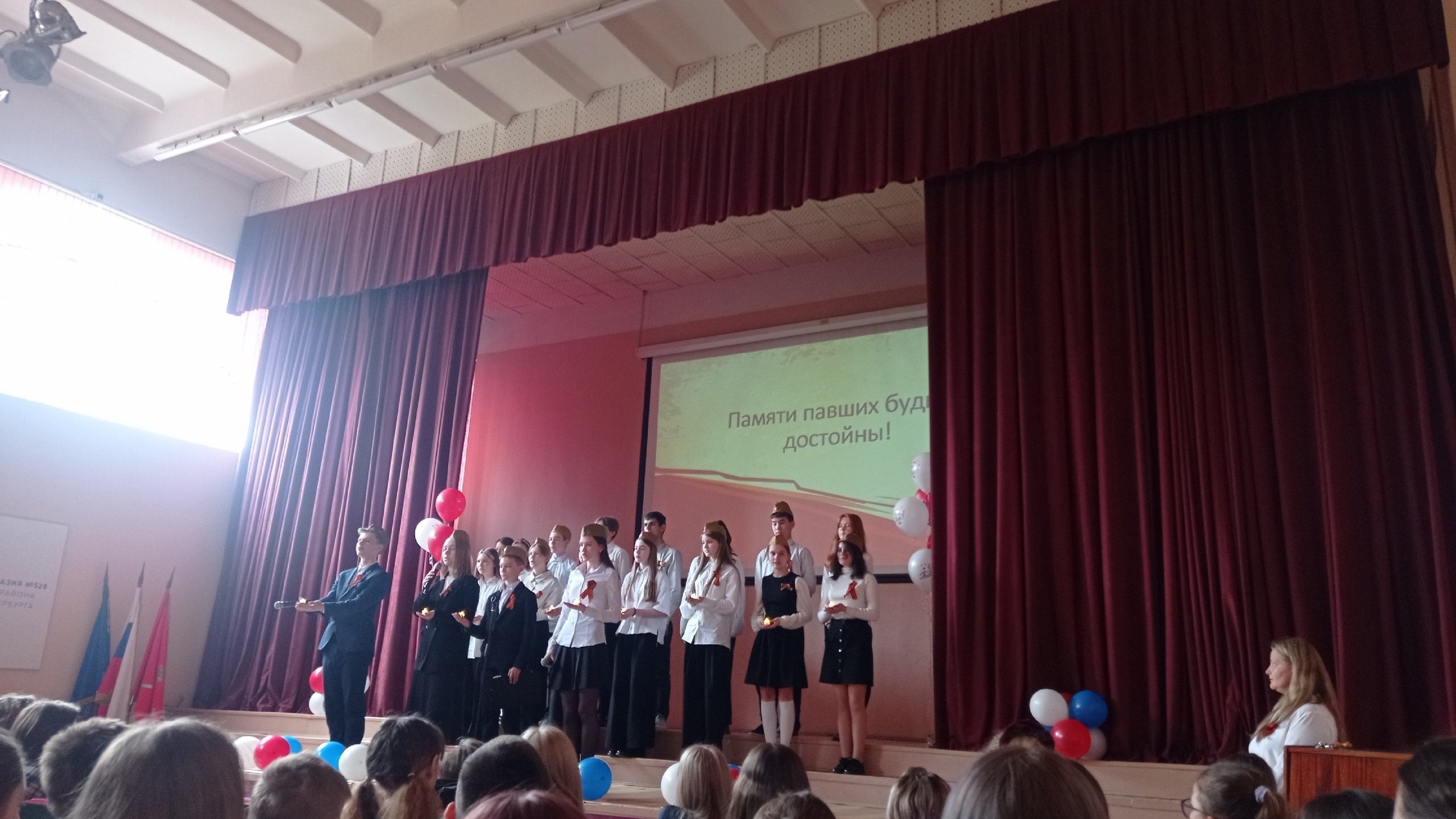 Активисты «Движения первых» и участники добровольческого отряда под руководством Приваловой И.А., учителя русского языка, собрали в актовом зале ребят, чтобы напомнить им о событиях Великой Отечественной войны и почтить память тех, кто не вернулся с фронта. В композиции были использованы кадры кинохроники, прозвучали стихи и песни о войне, ребята пытались представить, как жили, что чувствовали их ровесники в годы, полные мужества и героизма.