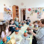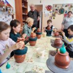 Побывали в небольшом уютном музее и послушали экскурсовода о жизни в селе около 100 лет назад, посмотрели как на гончарном круге чудесным образом появляются изделия из глины (кружки, миски, горшки, кринки) — взрослые (родители) даже попробовали сами — ничего не получилось, а дети в это время полепили из красной глины, которую добывают на р. Оять — и у них получились симпатичные рыбки! Затем попытались расписать уже обожжённые горшки ангобом — это техника рисования белой глиной, которую тоже добывают на р. Оять, из «груши». И завершилось все долгожданным пикником! Ура!