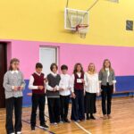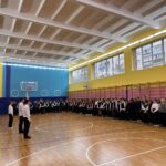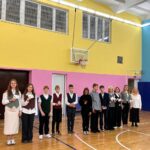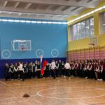 В спортивном зале старшего корпуса почётное право вынести флаг было предоставлено знамённой группе в составе: Нуриев Руслан, Соколов Максим, Шведова Ульяна.
