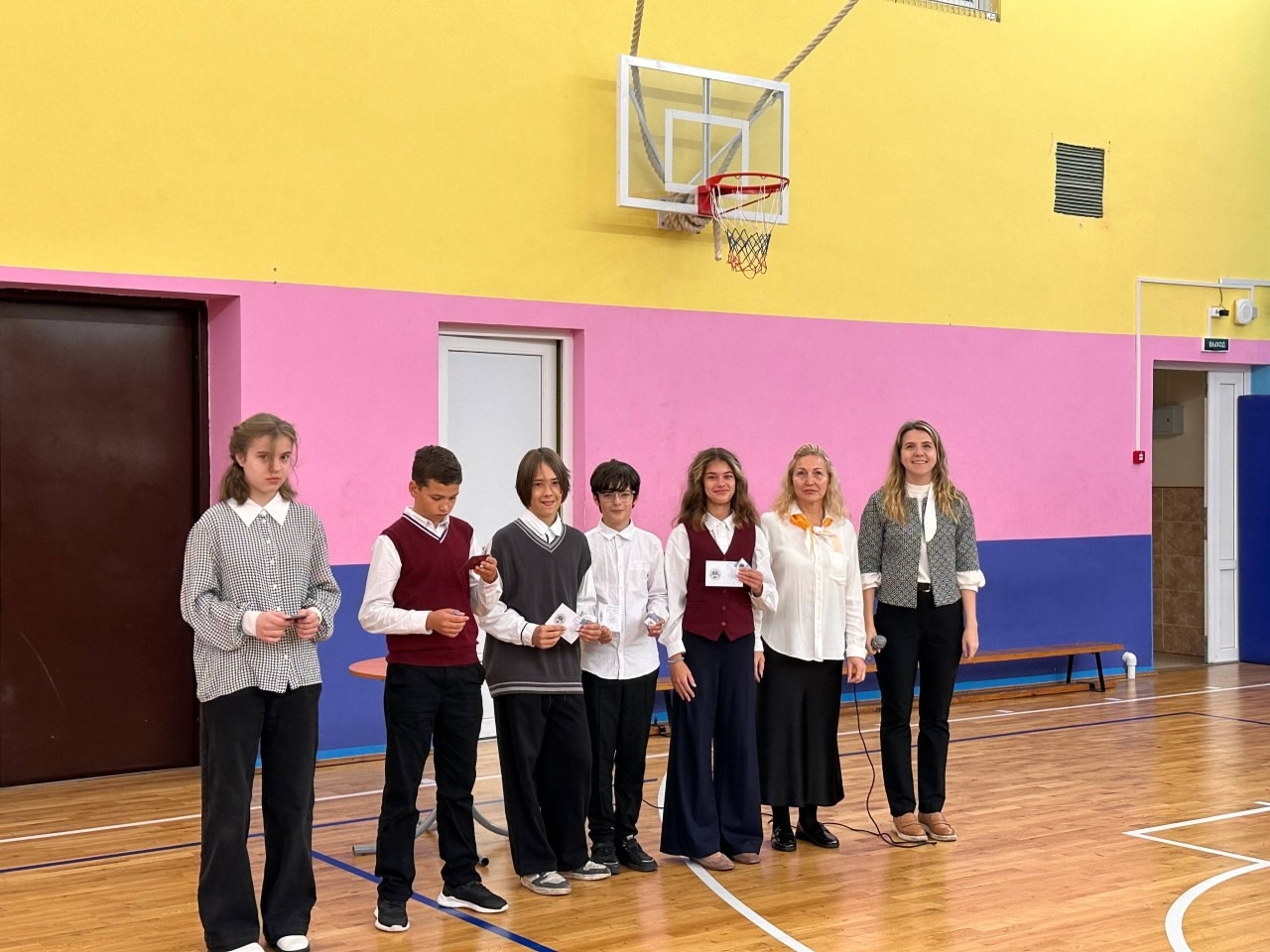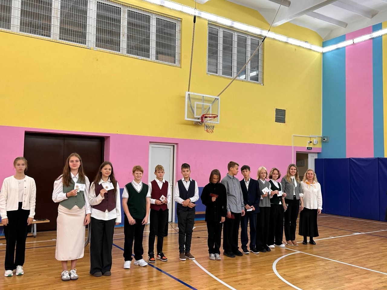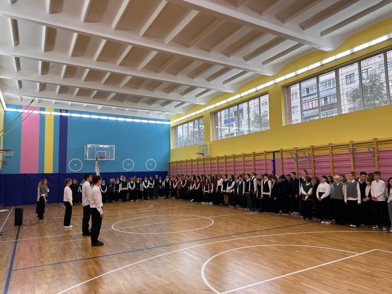 В спортивном зале старшего корпуса почётное право вынести флаг было предоставлено знамённой группе в составе: Нуриев Руслан, Соколов Максим, Шведова Ульяна.