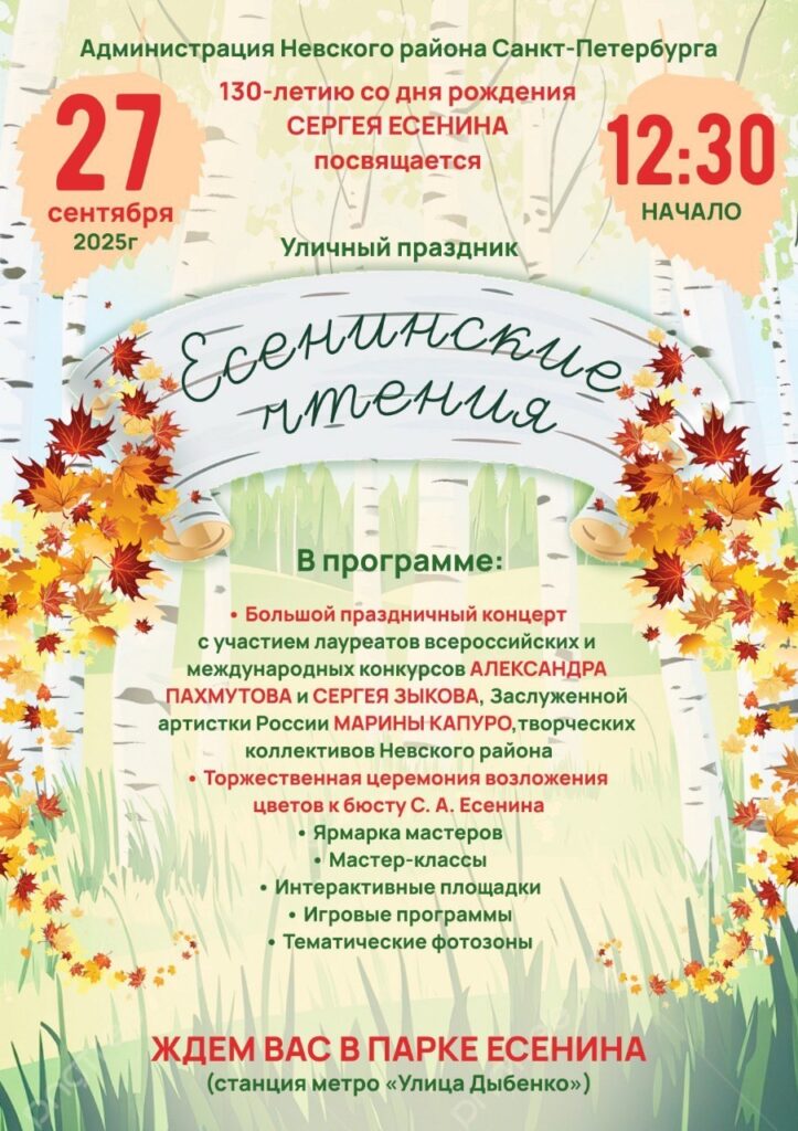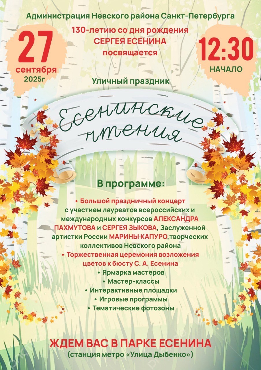 27 сентября в Невском районе вновь пройдет большой осенний праздник «Есенинские чтения». В парке Есенина жителей ждет праздничный концерт, интерактивные зоны, ярмарка мастеров, мастер-классы, тематические фотозоны и квесты. Мероприятие совместно готовят районные учреждения культуры, образования, спорта, молодежной политики и социальной защиты населения. Начало в 12:30.