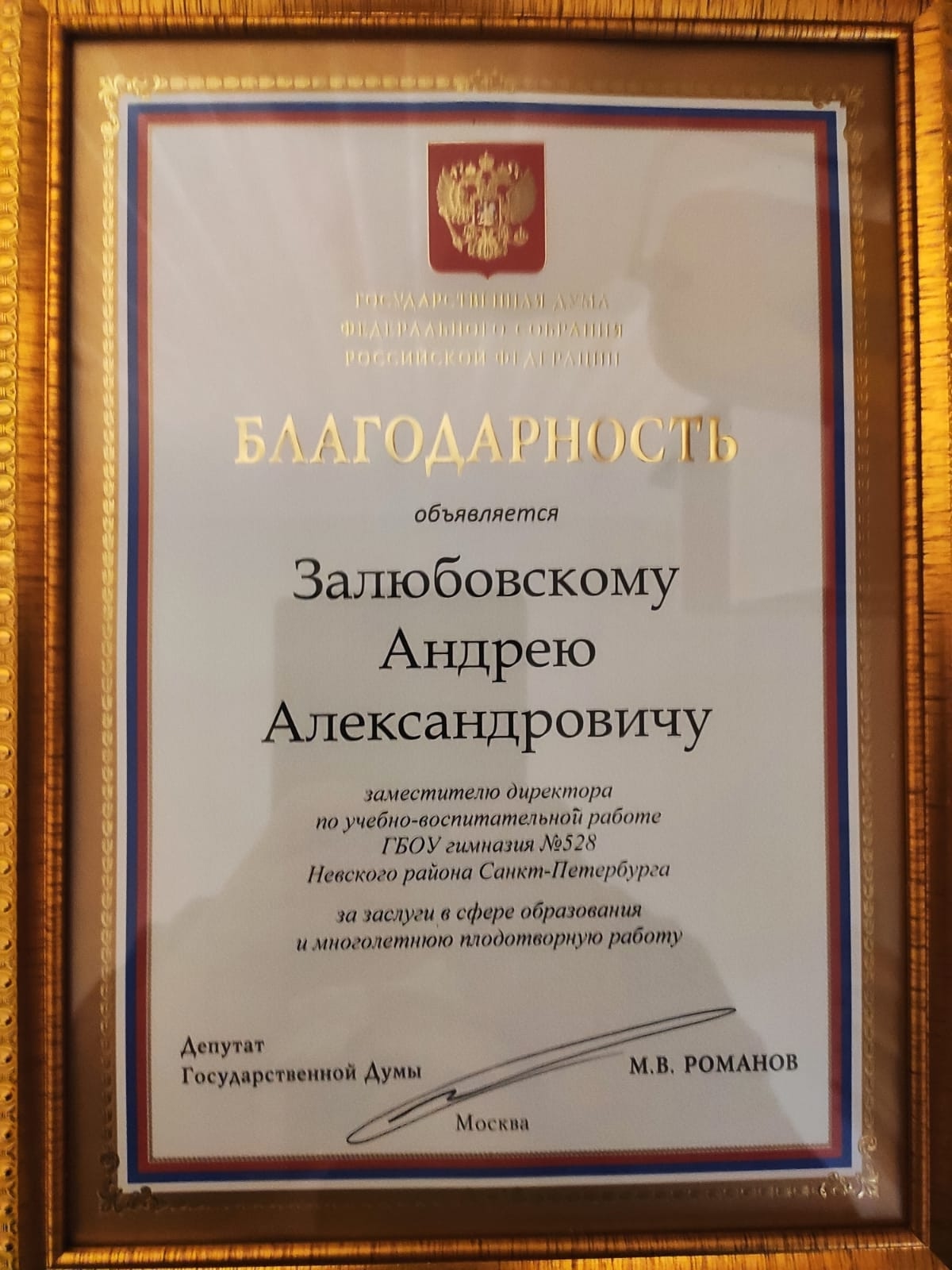 Андрей Александрович Залюбовский, заместитель директора гимназии, сегодня награждён благодарностью Депутата Государственной Думы М.В.Романова ЗА ЗАСЛУГИ В СФЕРЕ ОБРАЗОВАНИЯ И МНОГОЛЕТНЮЮ ПЛОДОТВОРНУЮ РАБОТУ.