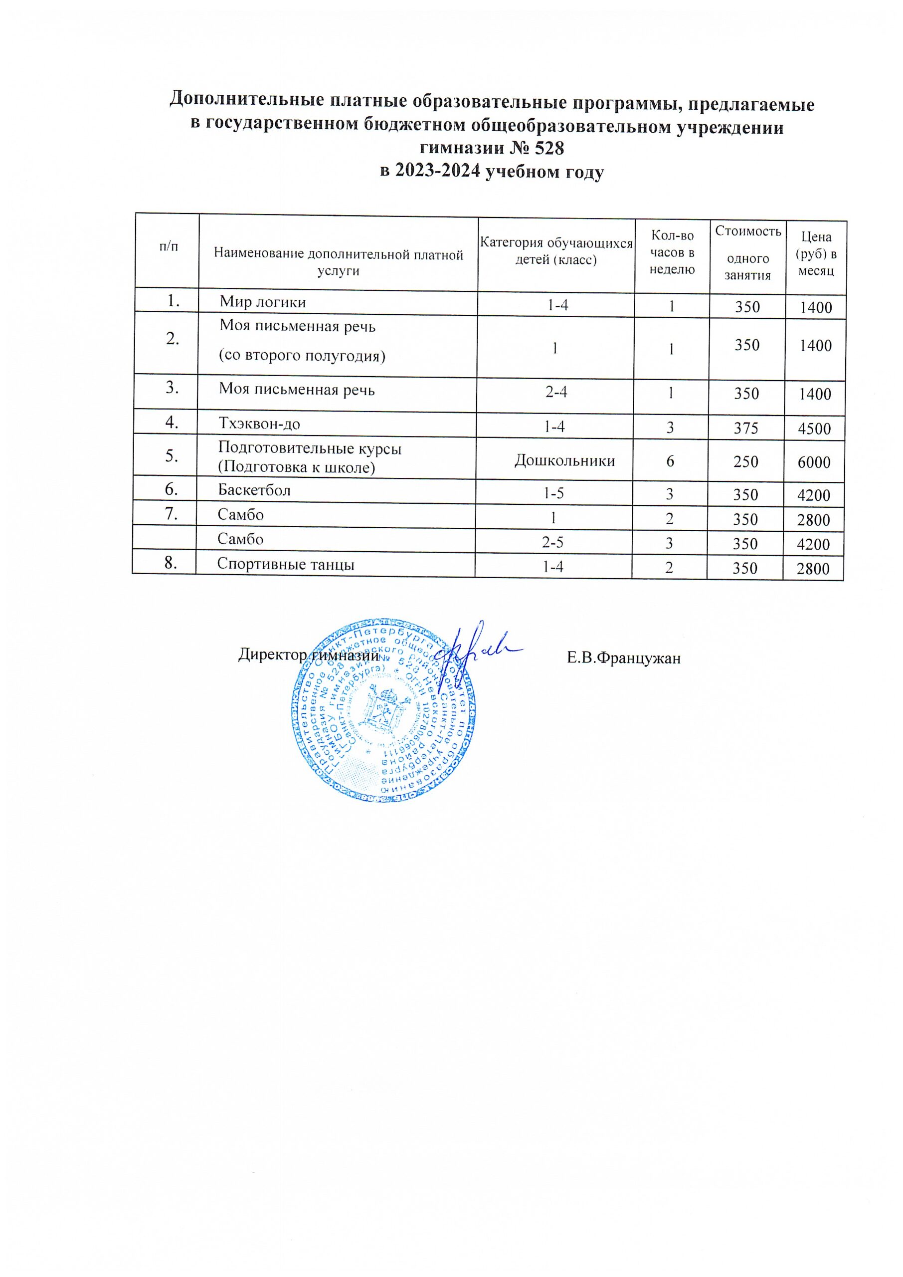 в) платные образовательные программы, предлагаемые в ГБОУ гимназии №528 в 2025 — 2026 учебном году: